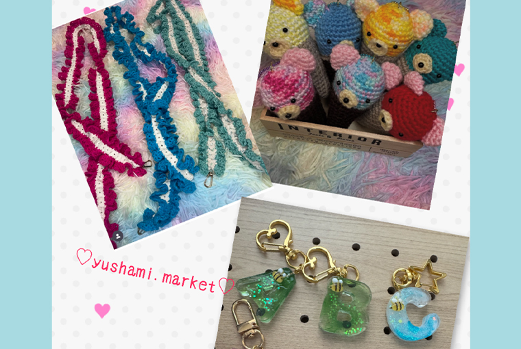 yushami.marketです!編み物とレジンそれぞれの作家として2人で活動しています!たくさんの方にyushamiの作品を手に取り、みて頂きたいと思っております。かわいい編みぐるみや手編みのバッグ、カラフルなレジンチャームなどyushamiならではの作品がいっぱいです!当日もかわいいハンドメイド作品を用意していきたいと思っておりますので、ぜひyushamiへ足を運んでみてください!